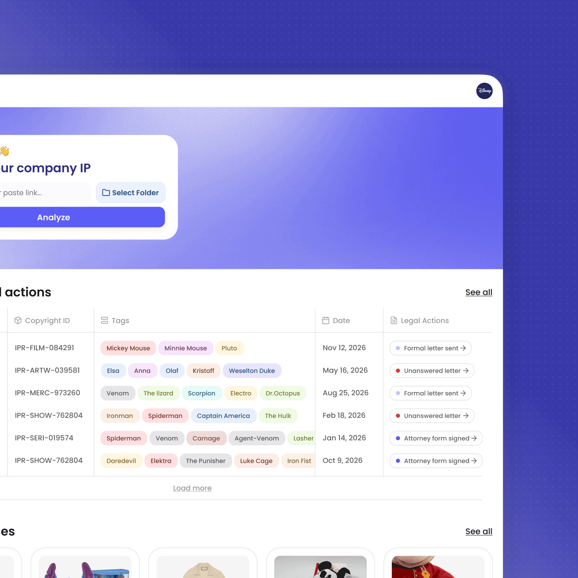 A one-week personal design challenge resulting in a software solution for IP protection, built to support legal teams in large companies dealing with counterfeiting and unlicensed products.